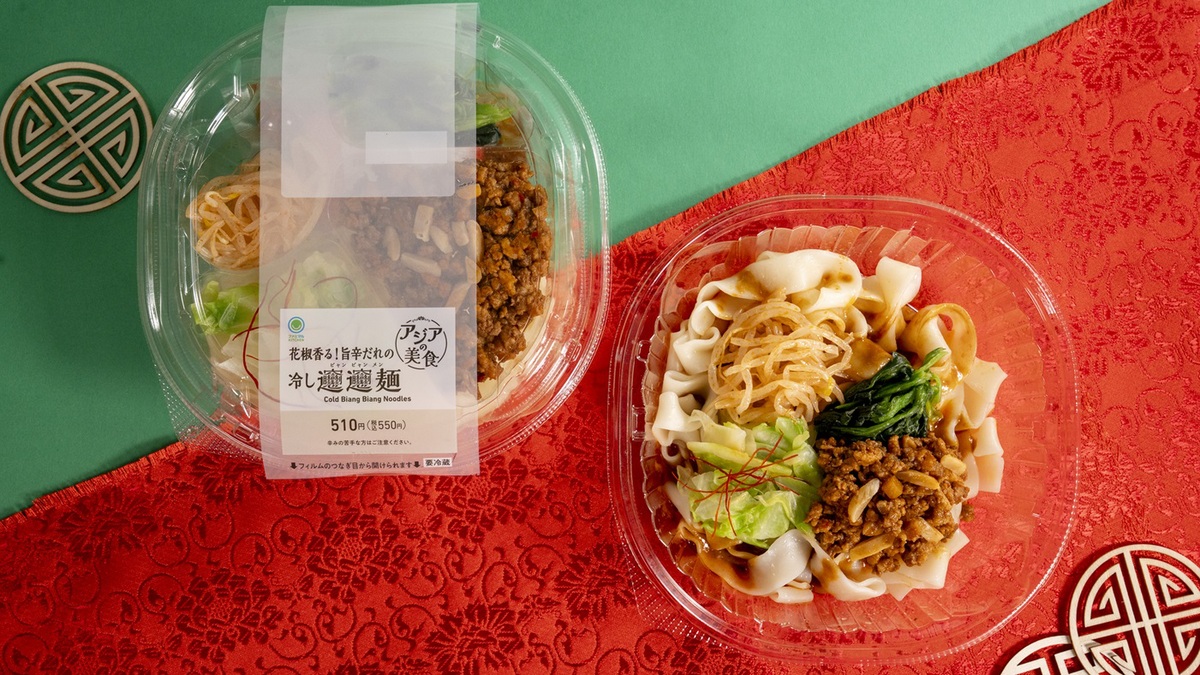 冷凍食品でも人気の中国料理「ビャンビャン麺」も登場。「冷しビャンビャン麺」は、中国・陝西省の名物をイメージした幅広麺と、ピリ辛ダレのバランスがクセになる一品です。