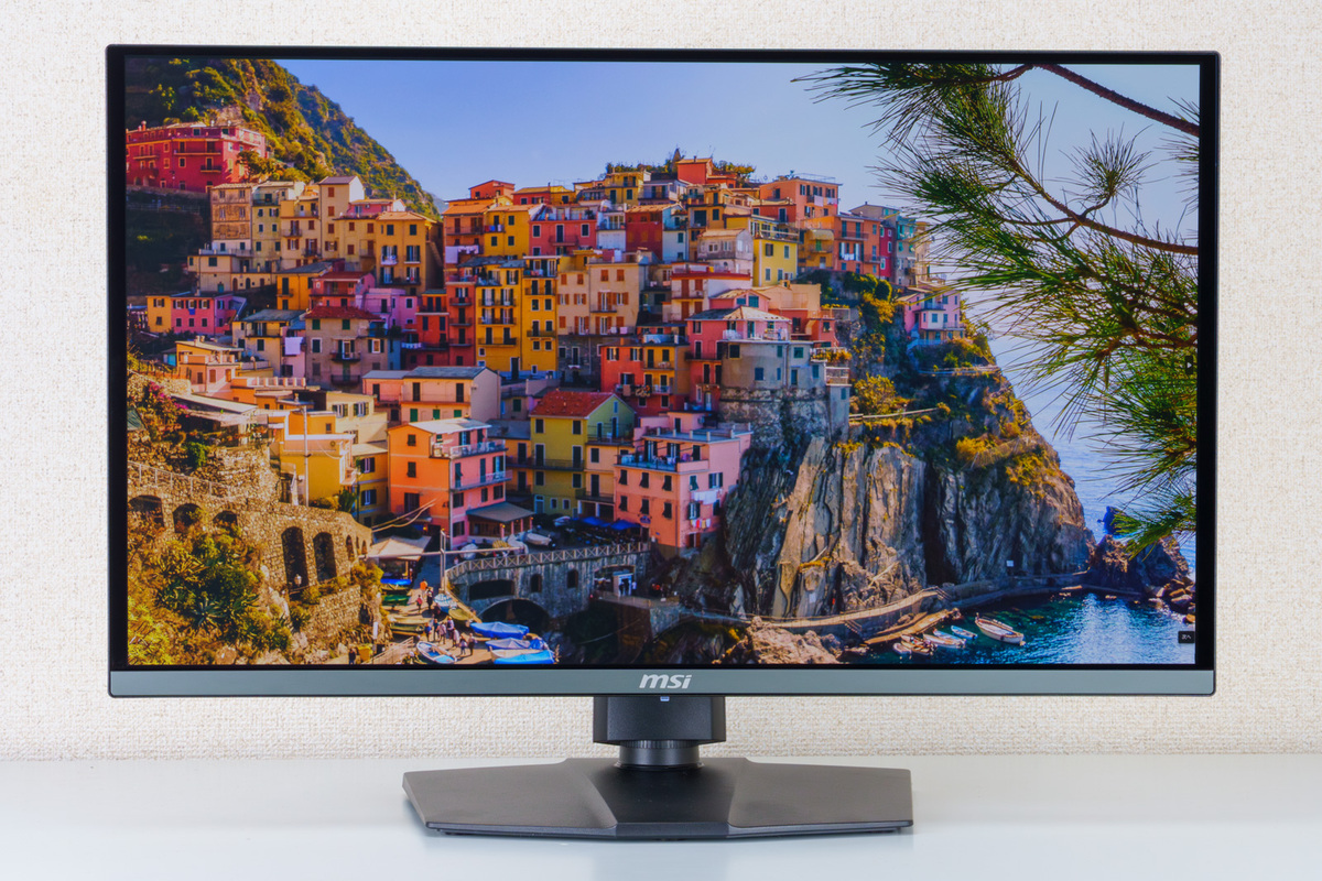 パネルは量子ドット技術によりカラーフィルター不要で、輝度を高めているQD-OLEDを採用し、26.5インチサイズで4K解像度を実現している。応答速度は0.03ms(GTG)で、リフレッシュレートは240Hz。最大表示色は約10億7300万色、コントラスト比は150万:1でVESAの「DisplayHDR True Black 400」「ClearMR 13000」(モーションブラーの等級付け。クリア画素とぼかし画素の比率をパーセントで表したぼかし性能の範囲で、11段階で最高位)の認定を受けている。色域のカバー率はsRGBが100%、AdobeRGBが97.5%、DCI-P3が99%とクリエイターが利用するレベルだ。