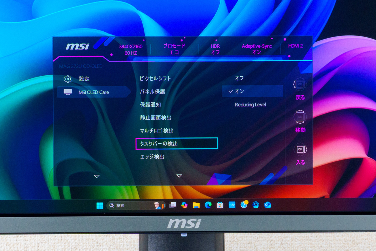 OLEDの場合は、同じ画像を表示し続けると焼付きの可能性がある。それを避けるために、「MSI OLED CARE 2.0」を搭載。ピクセルシフトやエッジ検出、タスクバー検出などパネルを保護する機能が用意されており、OSD画面で設定できる