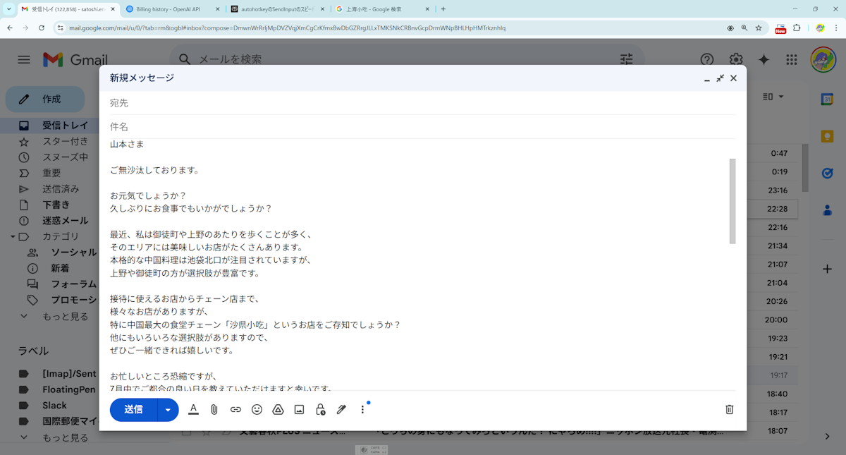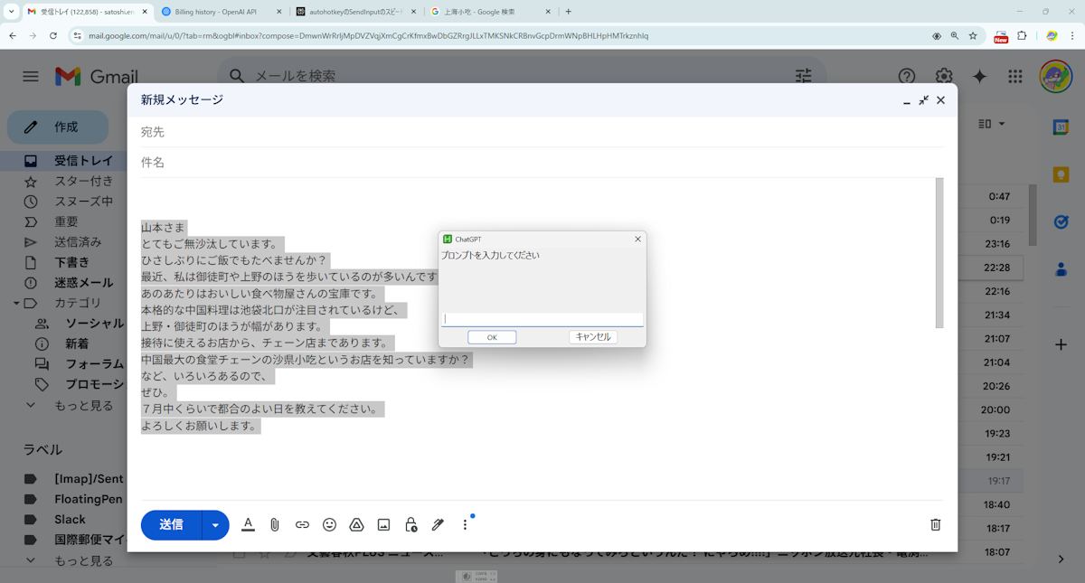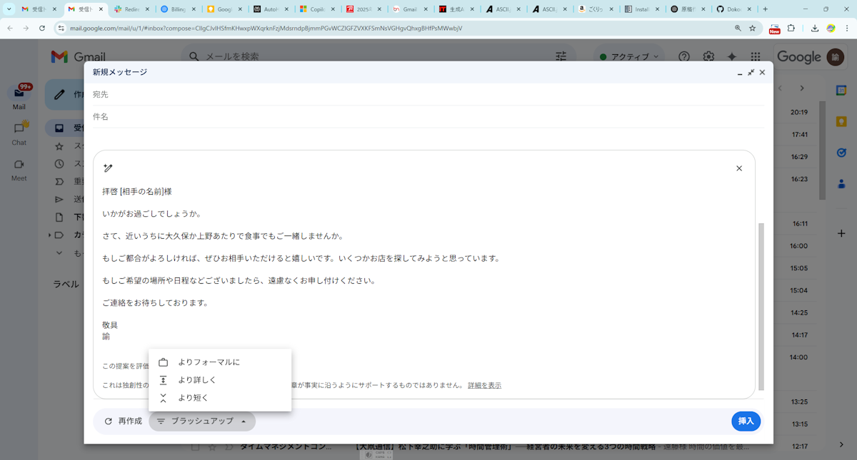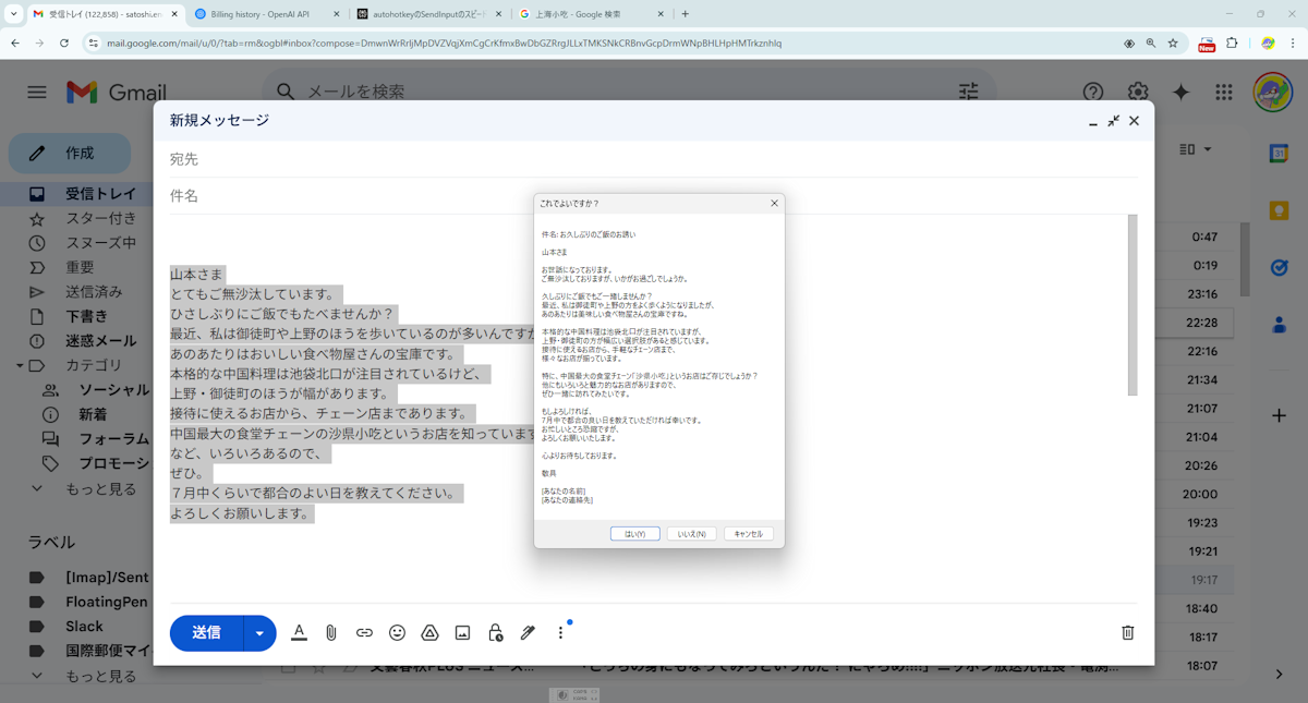 ここで、「丁寧なメールの文面に。改行を頻繁に入れて読みやすく」などというプロンプトを与えてやる。すると3、4秒の沈黙のあと「これでよいですか?」というAIからの返答がポップアップする。