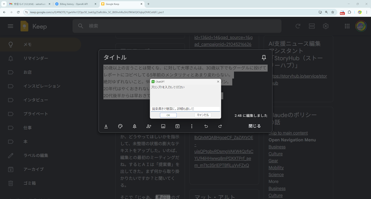このようなGoogle Keepのメモは、「どこでもGPT」を使えば、あとで読みやすいものに書き換えることができる。メモを選択して「箇条書きで簡潔に、誤植も直して」と指示するだけで、読みやすい形式に変換してくれる。