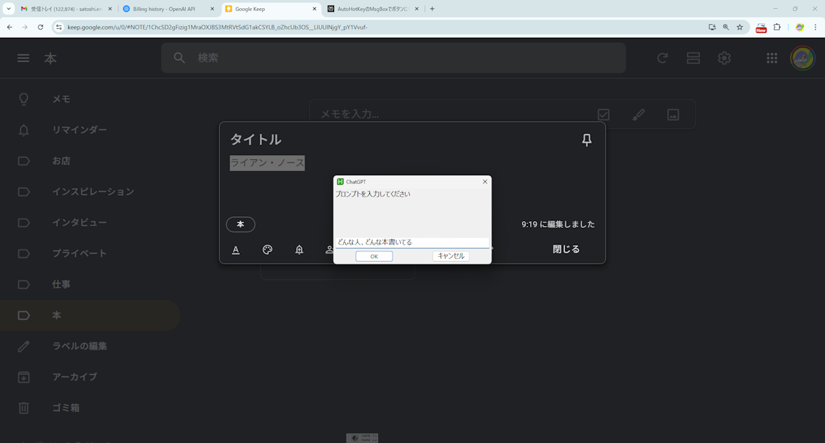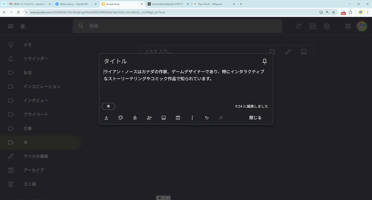 Google Keepには、たった一言だけ「ライアン・ノース」などと書かれたメモも入っていたりする。これも、「どこでもGPT」で「どんな人、どんな本書いてる」などとやると答えが出てくる。Webで検証はせず、単純に言語モデルを呼び出しているだけなのであまり欲張らないことだ。