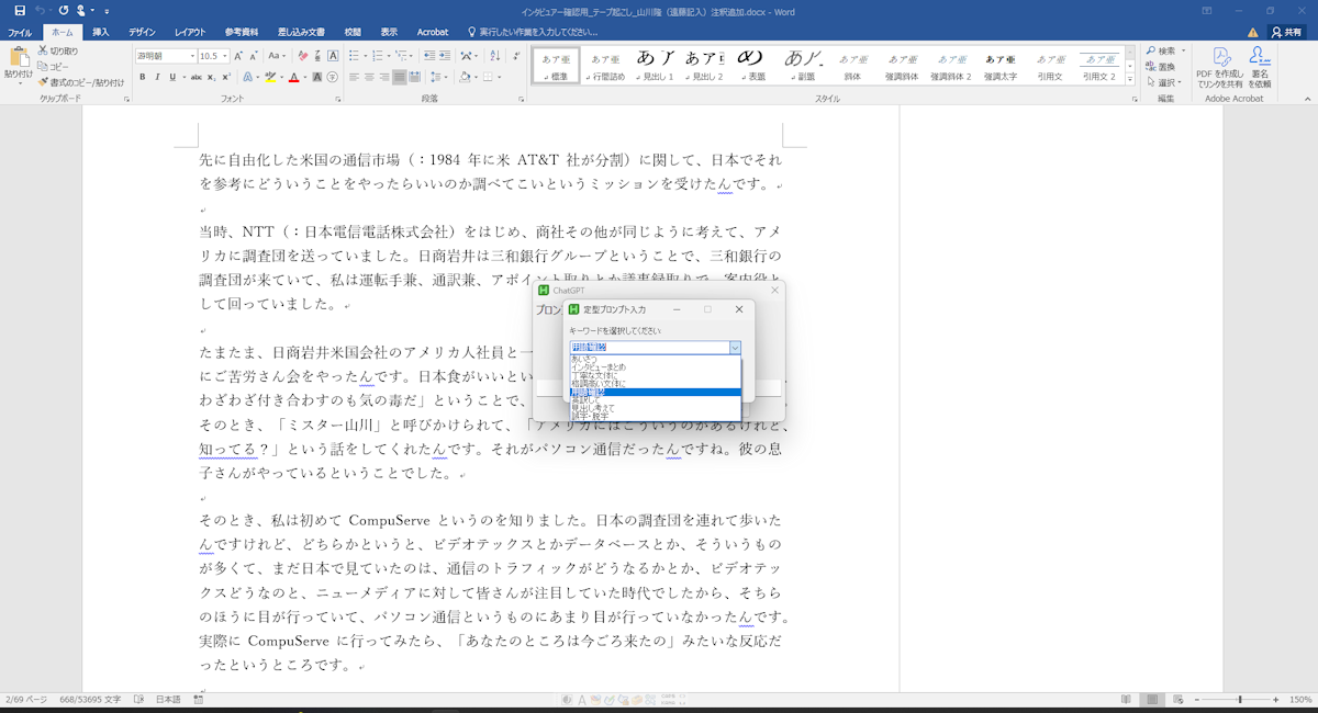 そこで、Wordで範囲選択して(テキスト全体でもよいが段落ごとくらいが作業的にはちょうどよい)、「どこでもGPT」を呼び出し上記のプロンプトを与えてやる。
