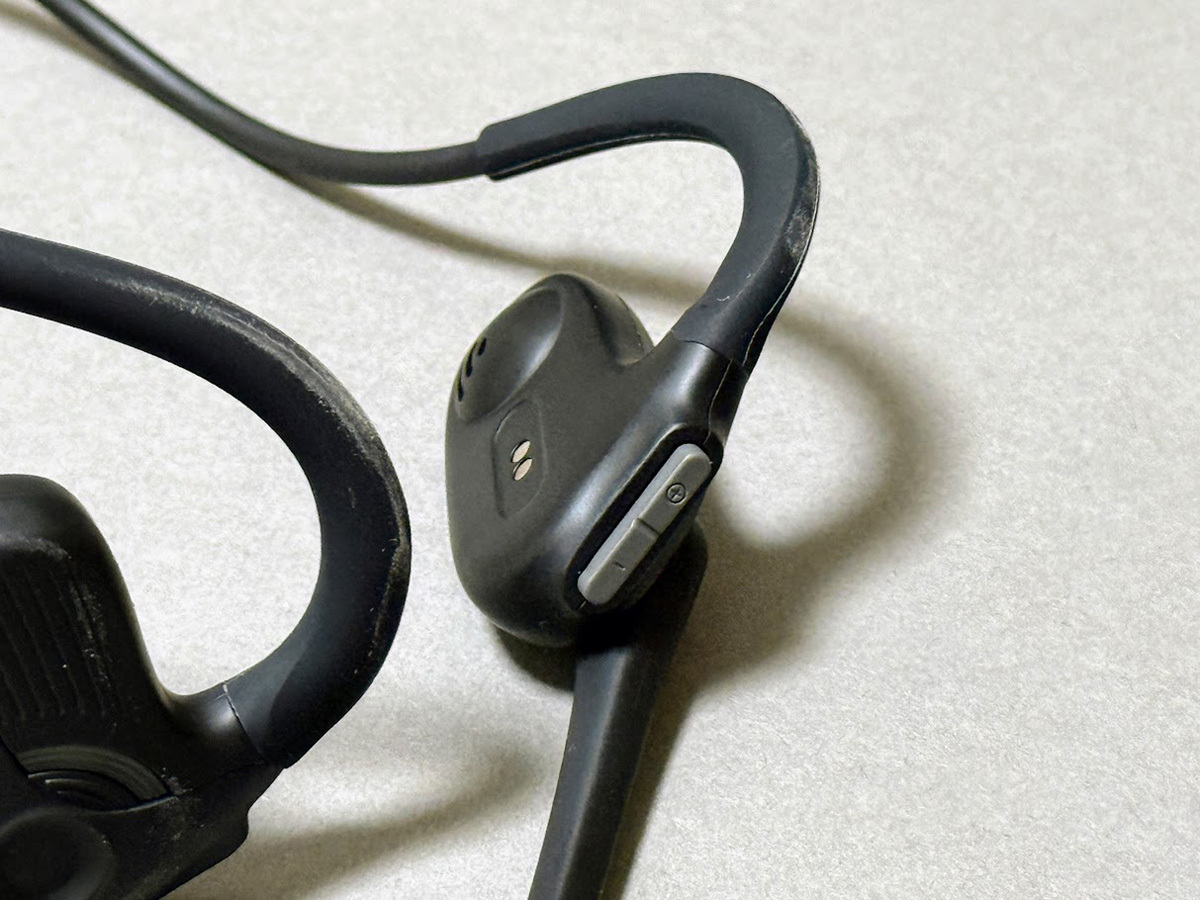 本体のスイッチは左側に搭載されており、「+」と「-」の二つだけとシンプル。「+」を長押しすると電源が入り、ペアリングモードに入る。「-」を長押しすると、ペアリング設定をリセットできる。本体はIPX4の防水性能も持っているので、雨に濡れるくらいなら問題なし。