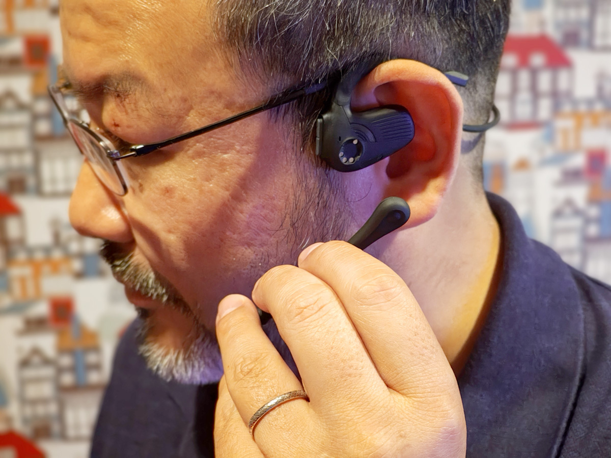 「ATOM AIMic Pro」の本体をチェックしてみよう。後頭部から耳にかけるタイプのオープンイヤー型で、重量は25gととても軽い。長時間利用しても耳が痛くなりにくいのはありがたい。周囲の音が適度に聞こえるので、声をかけられた時などもすぐに反応できる。
