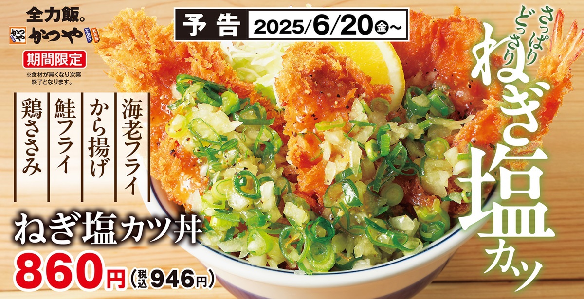 とんかつ専門店「かつや」は、「ねぎ塩カツ丼」「ねぎ塩カツ定食」を6月20日より期間限定で発売します。