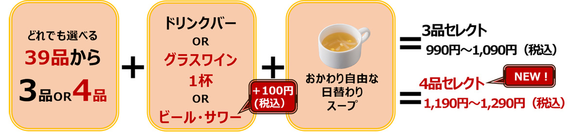 内容:選べる「4つのメニュー」と、ドリンクバー(orアルコール)、日替わりスープバー