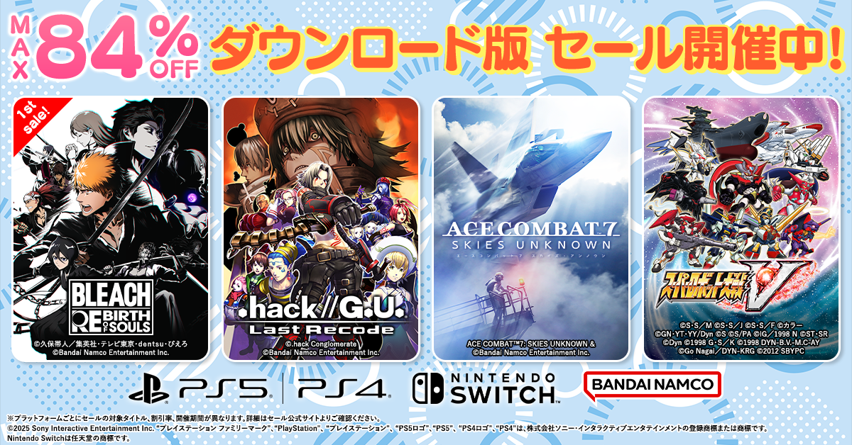 また、人気タイトルであるPS4版「ACE COMBAT™7: SKIES UNKNOWN」が48%オフの1716円、Switch版「スーパーロボット大戦V」が52%オフの3990円で購入可能。最大割引率でいうと、新感覚すごろくマネーゲーム「ビリオンロード」が84%オフの990円で購入できる。