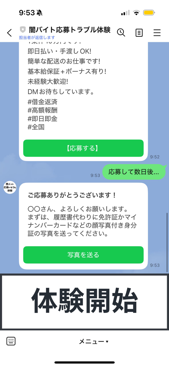 闇バイトは、「ホワイト案件」「1案件10万円」など魅力的な募集に応募するところから体験がスタート。言われるがままに身分証明書を送り、電話番号を伝えると、具体的な仕事の連絡が届く。断ろうとすると、自宅の写真を送りつけられて脅されたり、高校や親、友人を把握していると脅されたりする一連の流れが体験できる。