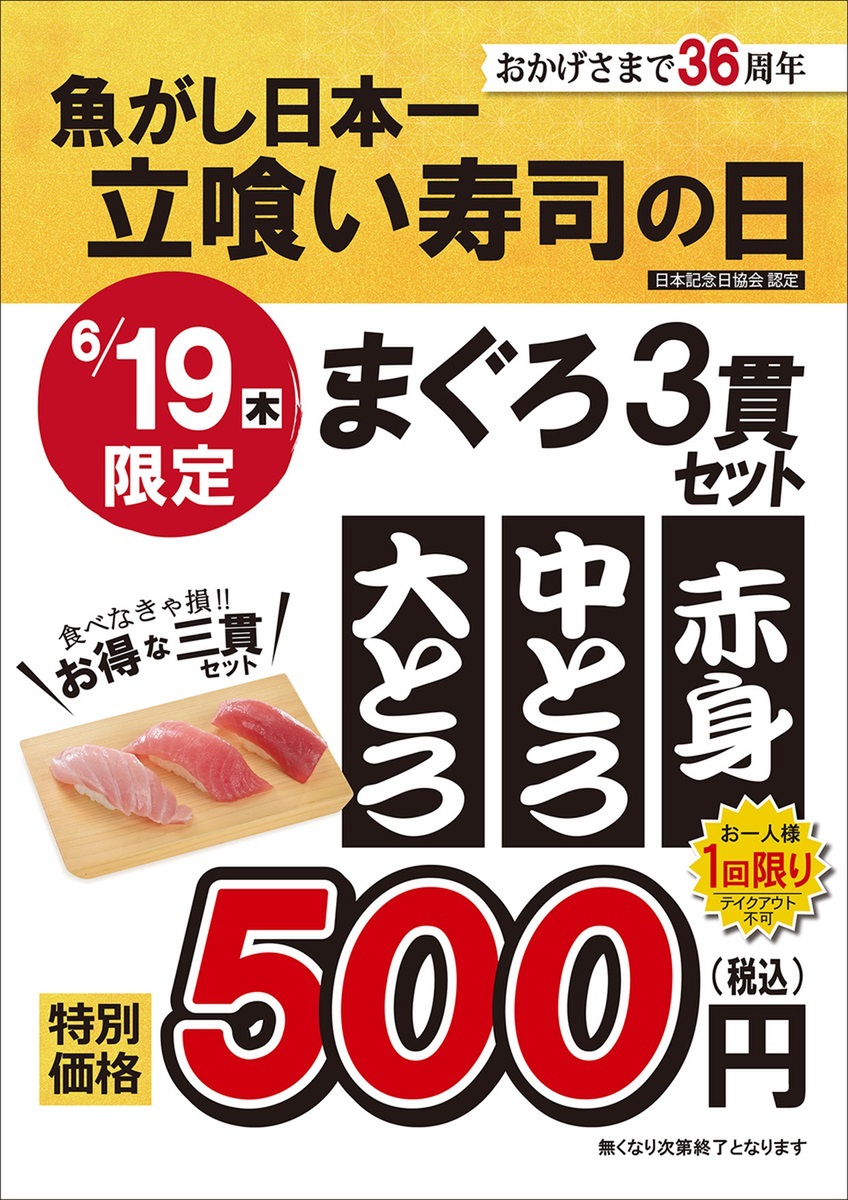 にっぱんが運営する「立喰い寿司 魚がし日本一」「本格江戸前寿司魚がし日本一」では、6月19日限定で「まぐろ3貫セット(大とろ・中とろ・赤身)」を特別価格500円提供します。