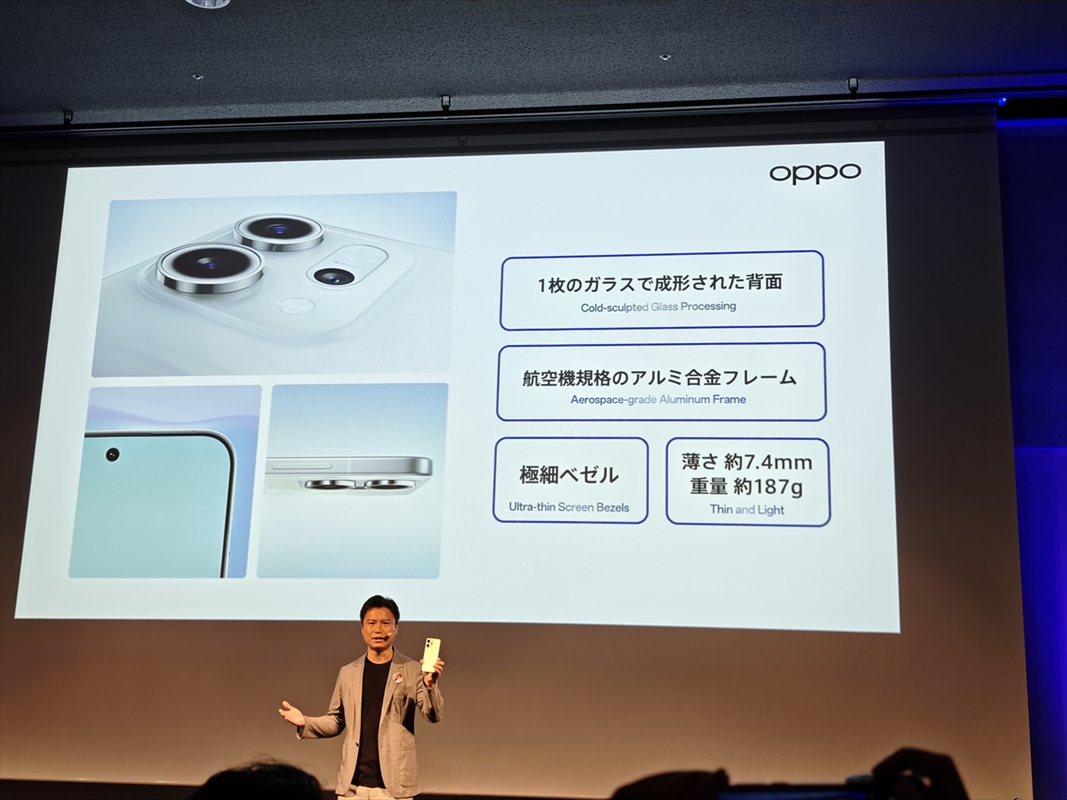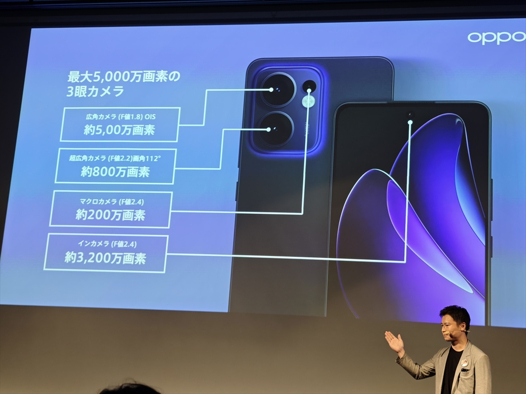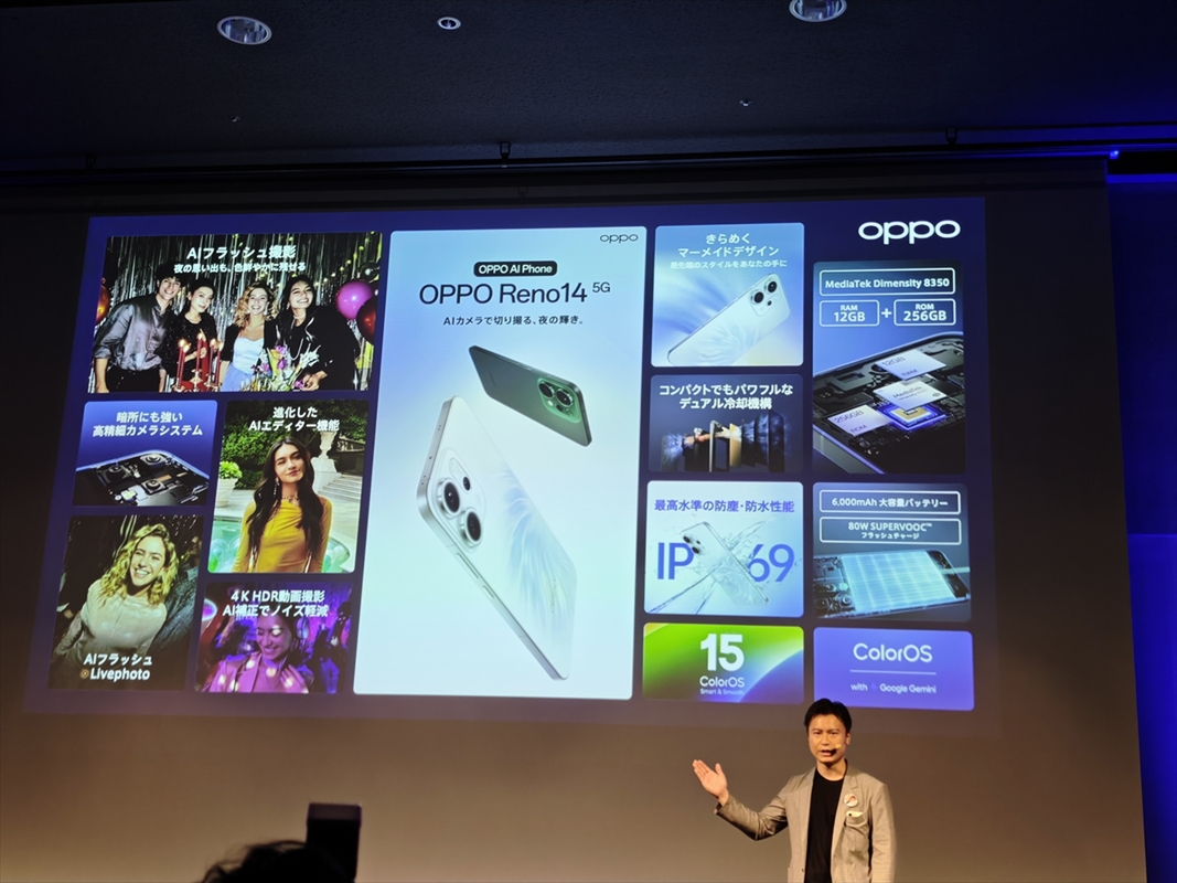 今回の発表会で特筆すべきは、日本がグローバルでの初披露の場となった「OPPO Reno 14 5G」です。同モデルは「価格と性能のミドルレンジの常識を覆す」と位置づけられ、7万9800円で7月17日に発売されます。