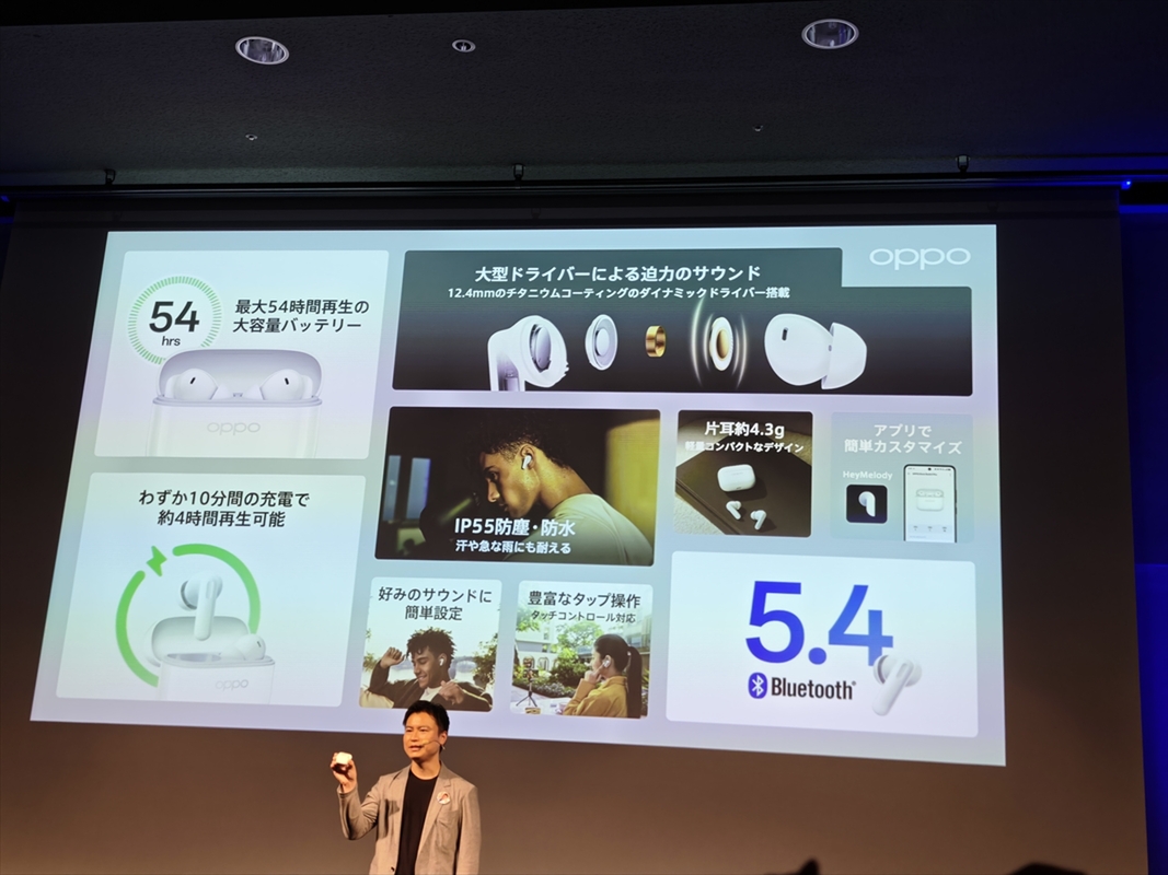 さらに、ワイヤレスイヤホン「OPPO Enco Buds 3 Pro」も2980円で6月26日に発売されます。最大54時間の音楽再生が可能で、10分の充電で約4時間使用できる急速充電に対応。12.4mmの大型ドライバーによる迫力あるサウンドと、IP55の防塵防水性能を備えています。