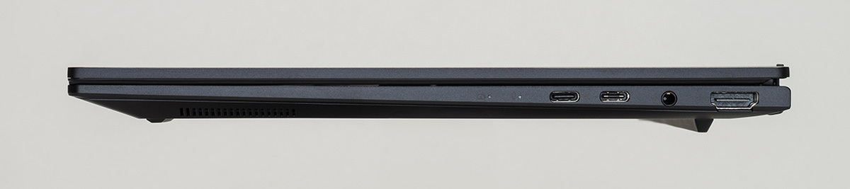 本体右側面にはUSB 3.2 Gen2 Type-C、USB4(Type-C)、マイクロホン/ヘッドホン兼用端子、HDMI 2.1端子が搭載されている。Type-C端子は両方ともデータ転送と映像出力、本体への給電をサポートしている
