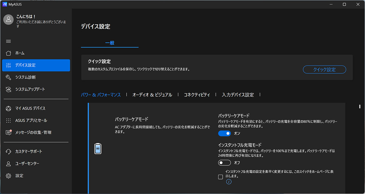 このほか、自宅やオフィスで据え置きで使う機会が多い人のための機能も用意されている。プリインストールされている「MyASUS」アプリの「バッテリーケアモード」を有効にすると、フル充電せずに、全容量の約80%を維持してバッテリーの劣化を抑えてくれる。