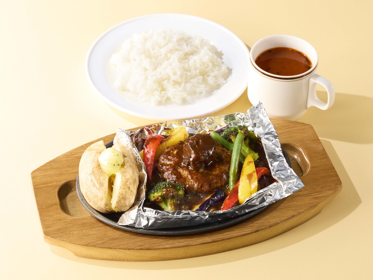 ココス自慢の包み焼きハンバーグと一緒に、ナスや赤パプリカ、黄パプリカといった夏野菜を別添えで提供。ジューシーなハンバーグをみずみずしい夏野菜と楽しめる。