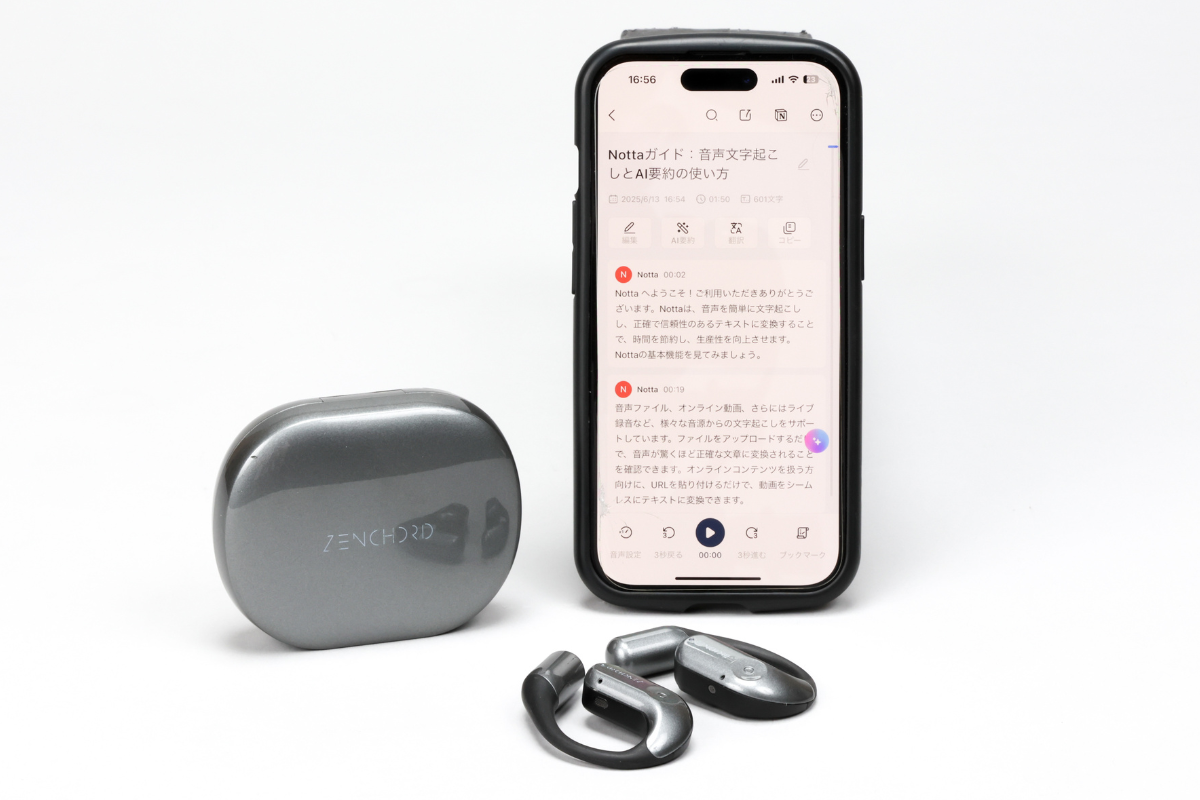 「Zenchord 1」は、クラウドベースの“AI文字起こし”で有名なNottaが手がけたハードウェアです。耳にかけるイヤホンと、机に置くケース型のマイクがセットになっていて、自分の声と周囲の声をまるっと拾って、文字として認識/保存してくれます。