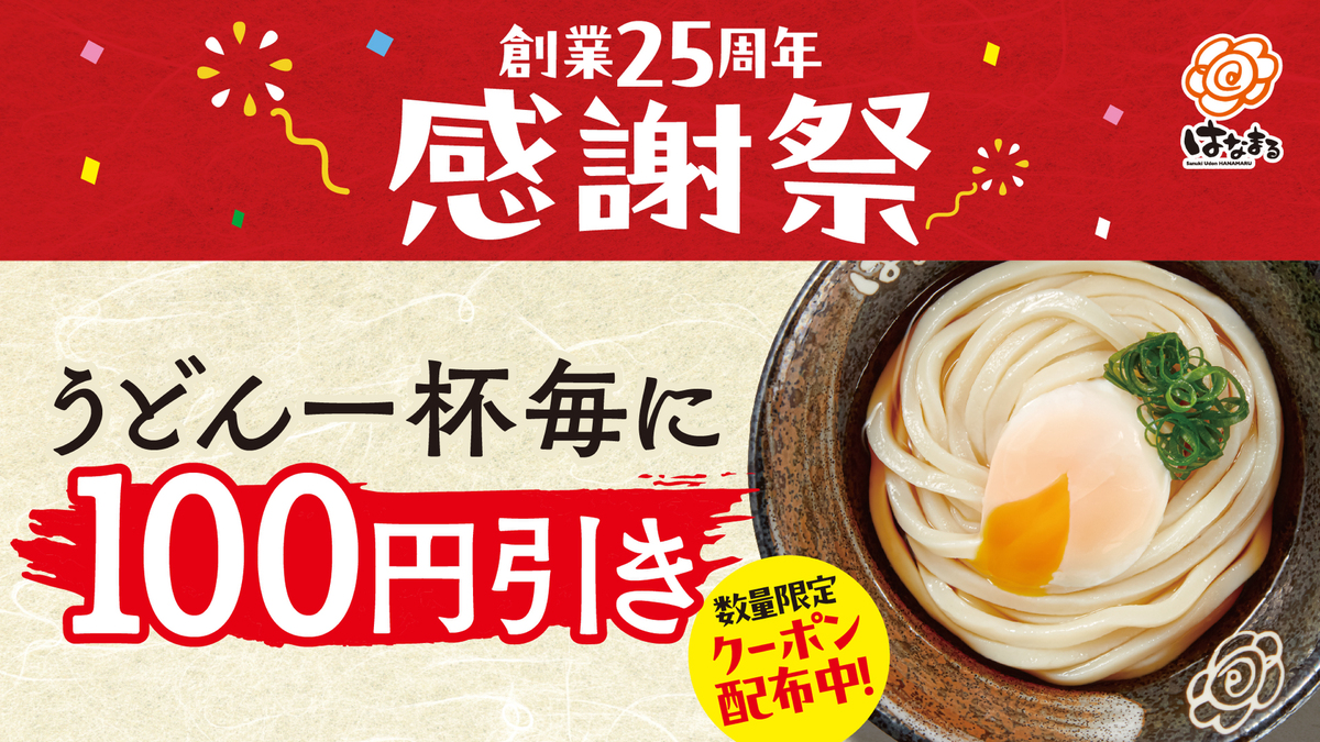 開催中の創業25周年感謝祭のキャンペーンとして、うどん1杯毎に100円引きになる特別クーポンを店舗で配布する。定番メニューや期間限定メニューなど、すべてのうどんに利用可能。