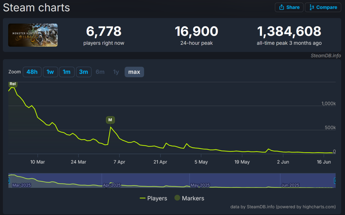 カプコンが2025年2月28日に発売した「モンスターハンターワイルズ」。発売から1ヵ月で全世界販売本数1000万本を達成するなど、記録的な大成功を収めた本作に異変が起きている。Steamの評価が“圧倒的に不評”となっているのだ。