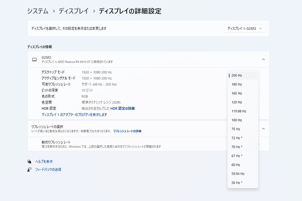 「G25F2」は最大200Hzのほか、100Hz、120Hz、165Hz、180Hzといった中間リフレッシュレートも選択可能になっていた。PlayStation 5などでの120Hz駆動にも対応しているが、「G25F2」のHDMI端子のバージョンは2.0になる。そのため、PlayStation 5でVRR(可変リフレッシュレート)は、有効にならない。
