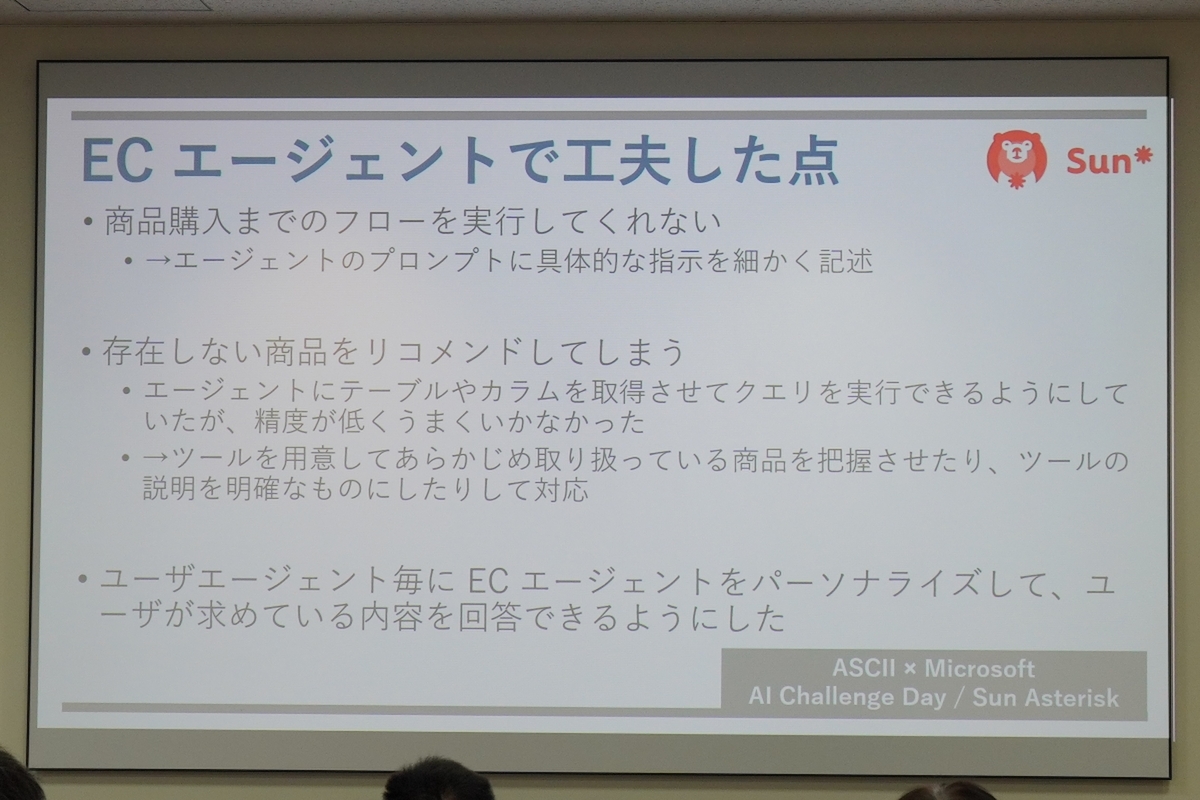 当初は、エージェントが商品購入までのフローを実行してくれなかったが、プロンプトに具体的な指示を細かく記述することでチューニング。存在しない商品をリコメンドしてしまう問題も、商品を把握させるツールを用意するなど試行錯誤を重ねた。