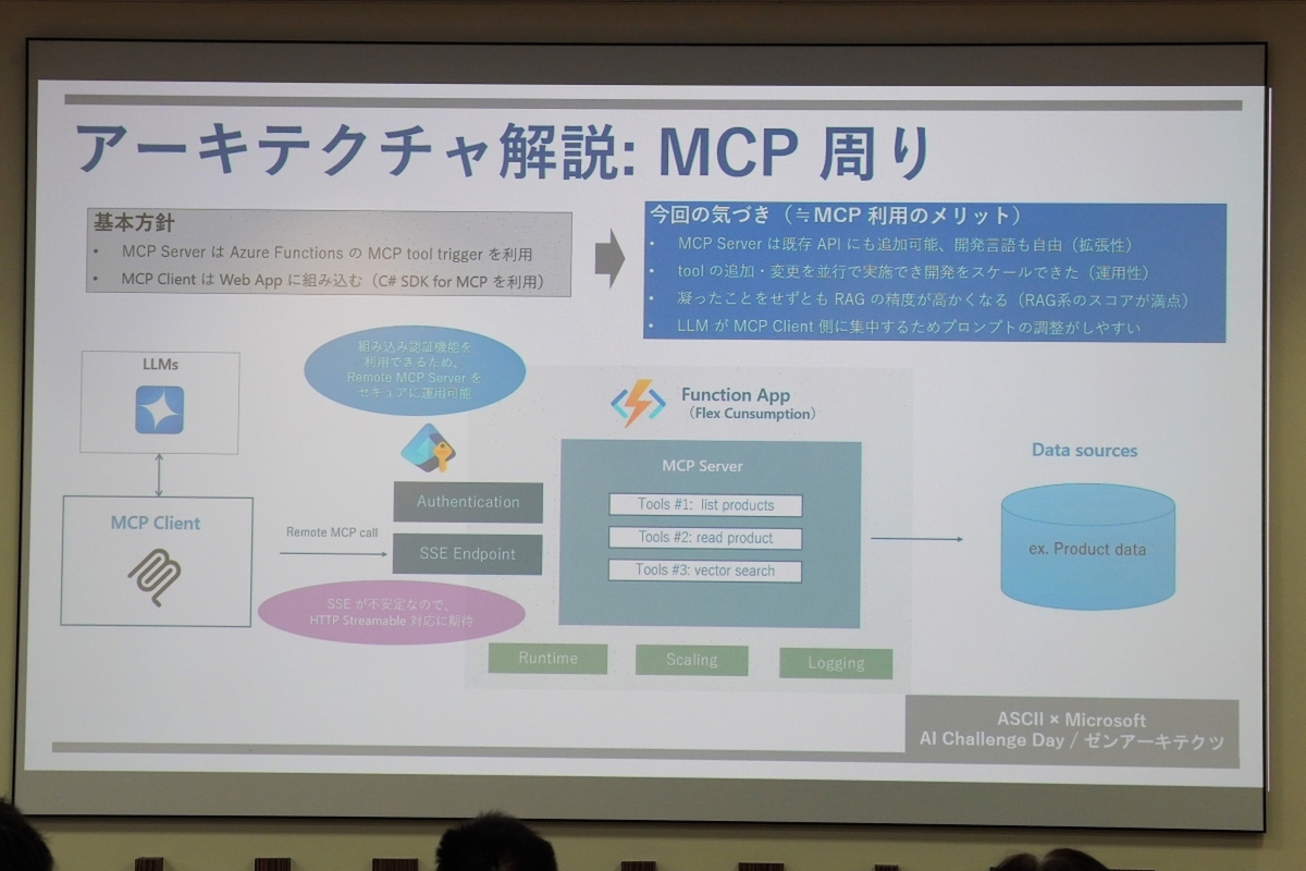 アーキテクチャはシンプルながら、慣れ親しんだSemantic Kernelでのプラグイン接続ではなく、すべてMCP接続することを選択。パーソナライズ化のためにメモリ機能を工夫し、スレッド単位ではなく、ユーザー単位で属性や好みなどを記録する“長期記憶”の仕組みも構築した。