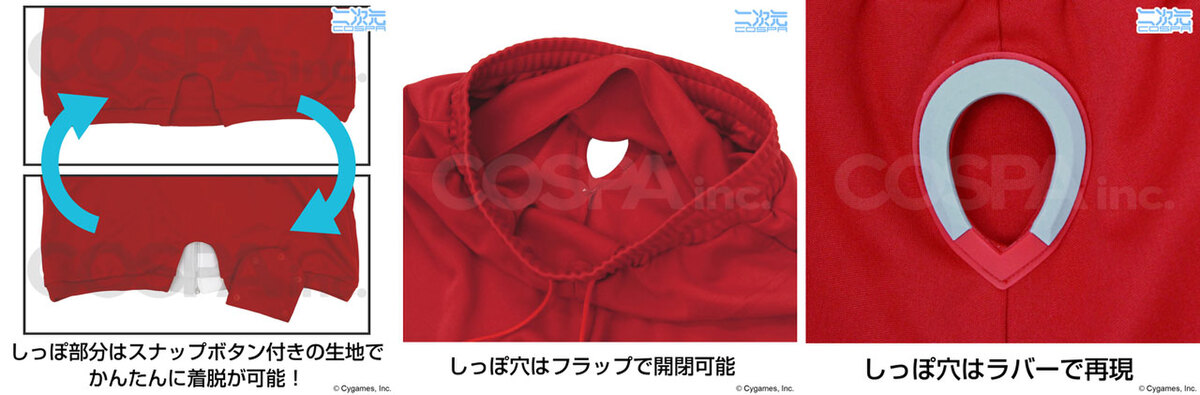 しっぽ穴はラバー素材で再現しているほか、付属のフラップで開け閉めも可能。伸縮性・通気性に富んだポリエステルジャージー素材を採用し、速乾性にも優れシワもつきにくい衣装となっている。