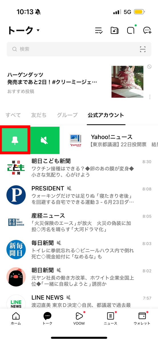 なお、よく使うアカウントは、右にスライドして表示されたピンマークをタップし、「ピン留め」すると上部に表示されるようになる。