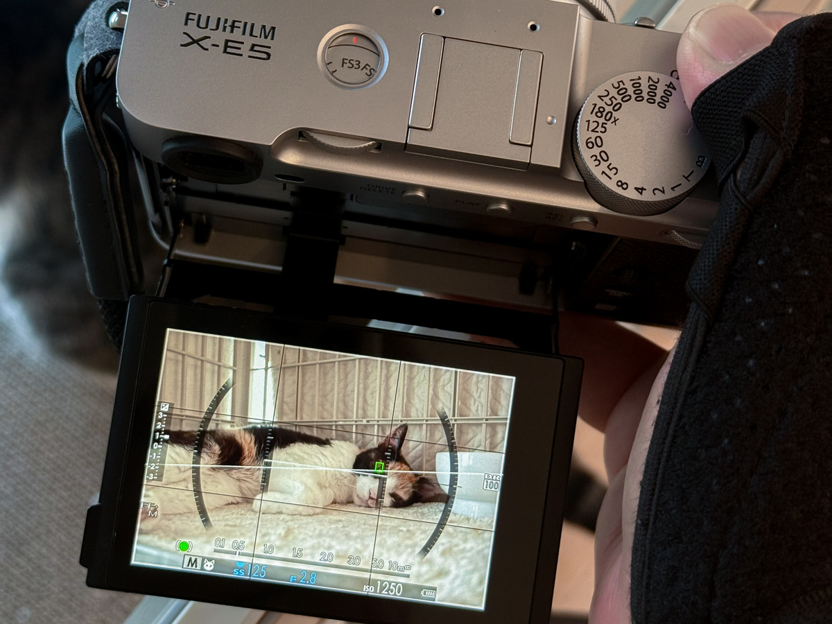 そして、やっとカメラの話。X-E5は上部がアルミ削り出しの高級感あるコンパクトなミラーレス一眼で、ちゃんとファインダーも搭載してるし、背面モニターも180度以上チルトするし(自撮りもできる)、ボディー内手ブレ補正も搭載してるしで、中身はちょっとした上位モデルなみ。写真をぴしっと撮るカメラなのだ。