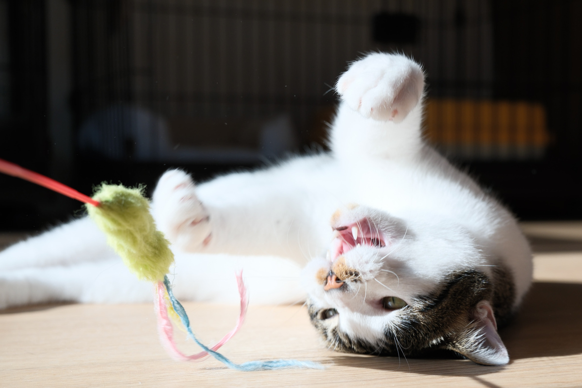 最後はいつもの「保護猫シェルターqueue」から。午後遅くに遊びにいくと、普段なら猫が昼寝から目覚めて活動し始める時間なのに、暑いせいかみんなぐでっと寝てる。そんな中、1匹だけ「誰も遊んでくれなくて退屈だ」って顔でうろうろしてるので遊んであげたのである。