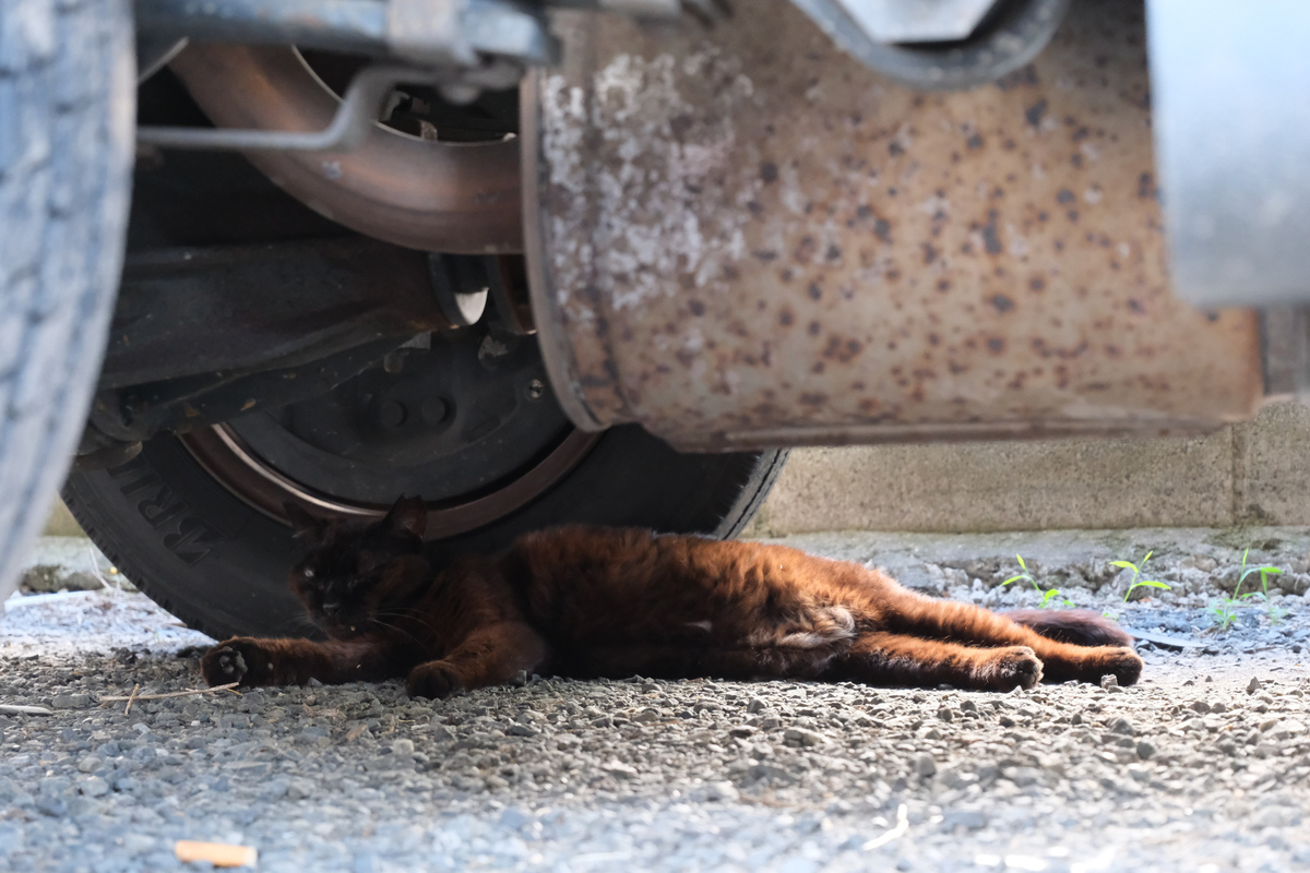 このあたり、数年前までは猫に何匹も出会えたものだけど、知人の猫写真仲間によると、最近はいなくなったのだという。ご時世的にしょうがあるまい、ってんでスナップ写真を撮りながら炎天下をぶらぶらしていると、かつて猫がいた駐車場が目に入る。夏の駐車場といえば車の下である。陽射しを避け、風が通っていくらか涼しい車の下に隠れてるのだ。