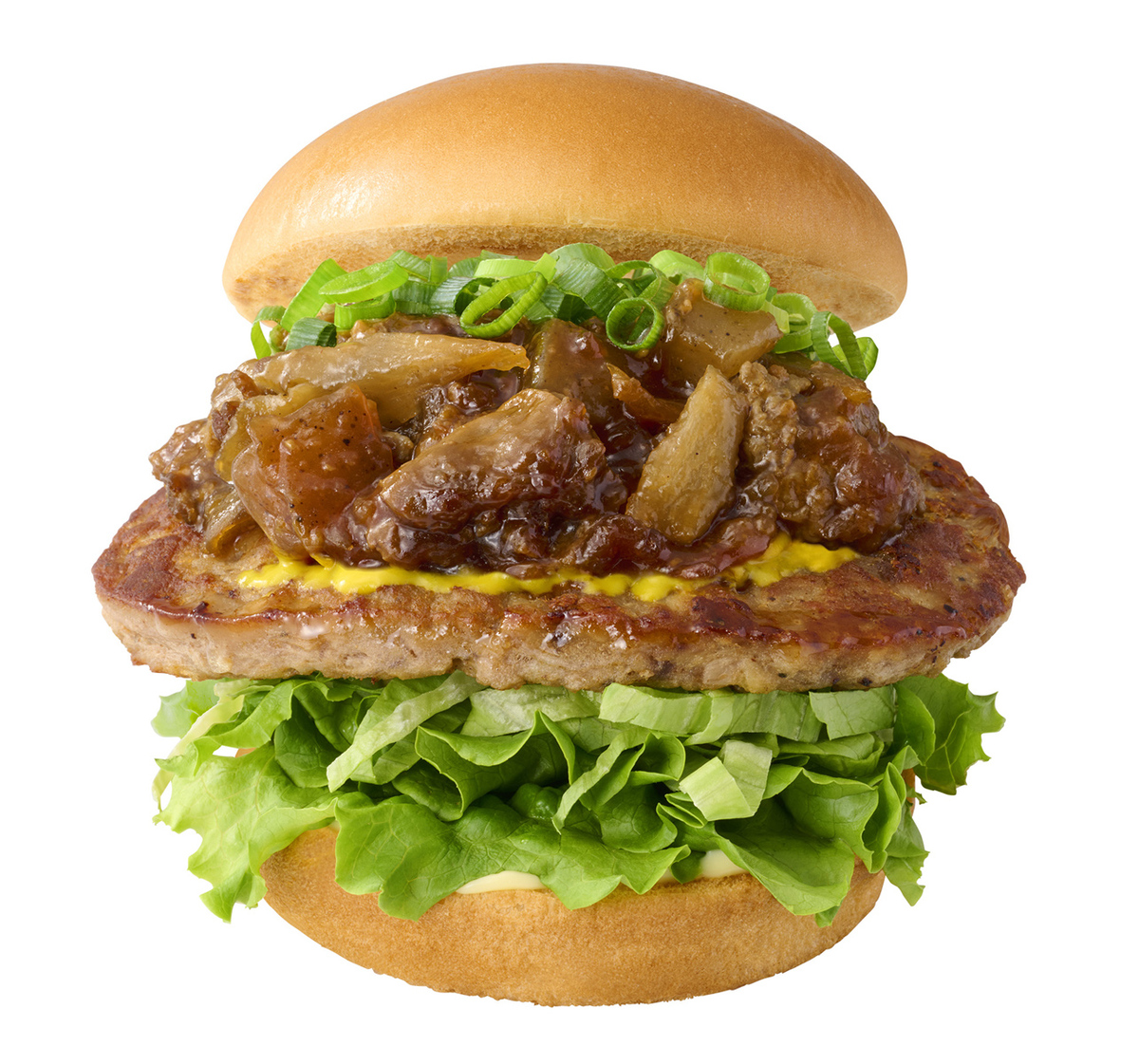 国産牛すじ、こんにゃく、ごぼうを煮込んだ具材を、国産牛100%使用のパティにたっぷりのせ、さらに広島県産の青ねぎを加えています。味噌と醤油の風味がしっかりと感じられ、コク深くややピリ辛な味わいを楽しめるといいます。