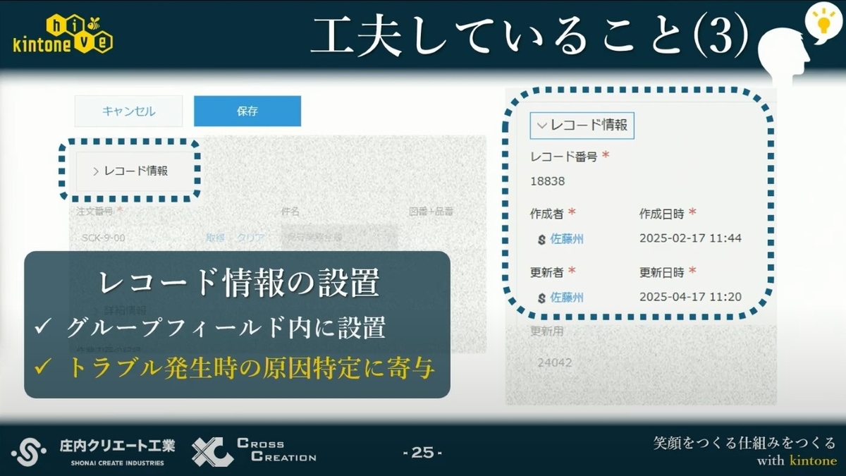 3つ目は、「レコード情報の設置」だ。グループフィールド内にレコード情報(レコード番号や作成者、更新日など)を置くことで、トラブル発生時の問い合わせをスムーズにした。
