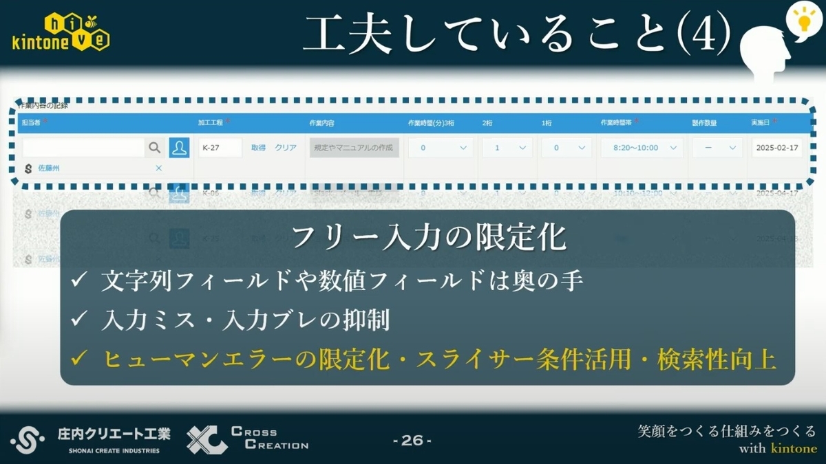 4つ目は、「フリー入力の限定化」だ。文字列や数値フィールドは“奥の手”とし、原則は選択式フィールドを用いた。入力のミスやブレをなくし、「ヒューマンエラーは必ず起こるものだが、選択式フィールドで限定化できる。スライサー条件や検索にも寄与する」と佐藤氏。