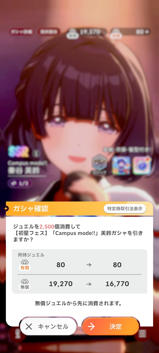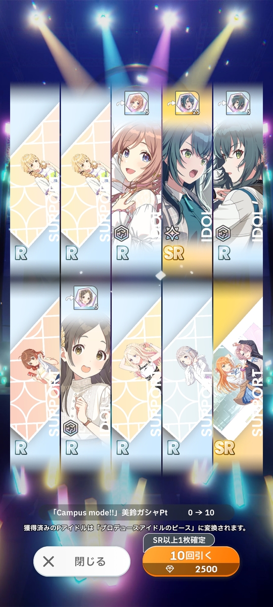 新ガシャはなんと最高レアリティSSRの出現率が1.5倍であり、優秀なキャラが多い「Campus mode!!」が含まれていることから、かなりのP(ユーザー)がガシャを回したと思われる。
