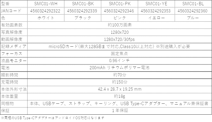 ボディカラーは、ホワイト、ブラック、ブルー、ピンク、イエローの5色となっています。