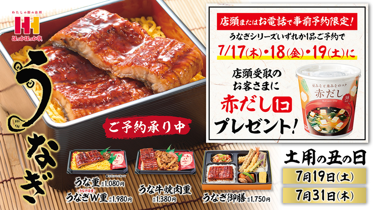 持ち帰り弁当のほっかほっか亭は、7月17日~19日の3日間限定で、うなぎメニューを予約した人に「赤だし」を1個プレゼントするキャンペーンを実施します。