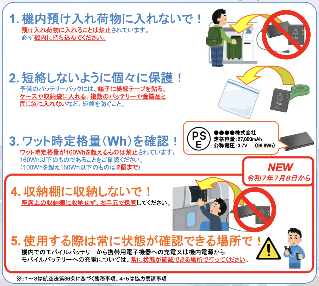 現在も、国土交通省では、国際民間航空機関が定める国際基準に基づき、機内預け入れ荷物にモバイルバッテリーを含めることを禁止しているほか、機内持込みについても持込み可能なモバイルバッテリーの個数・容量を制限しています。