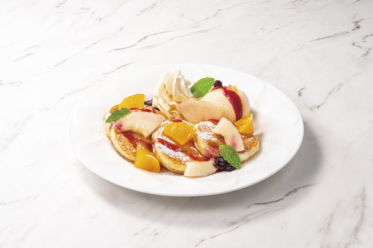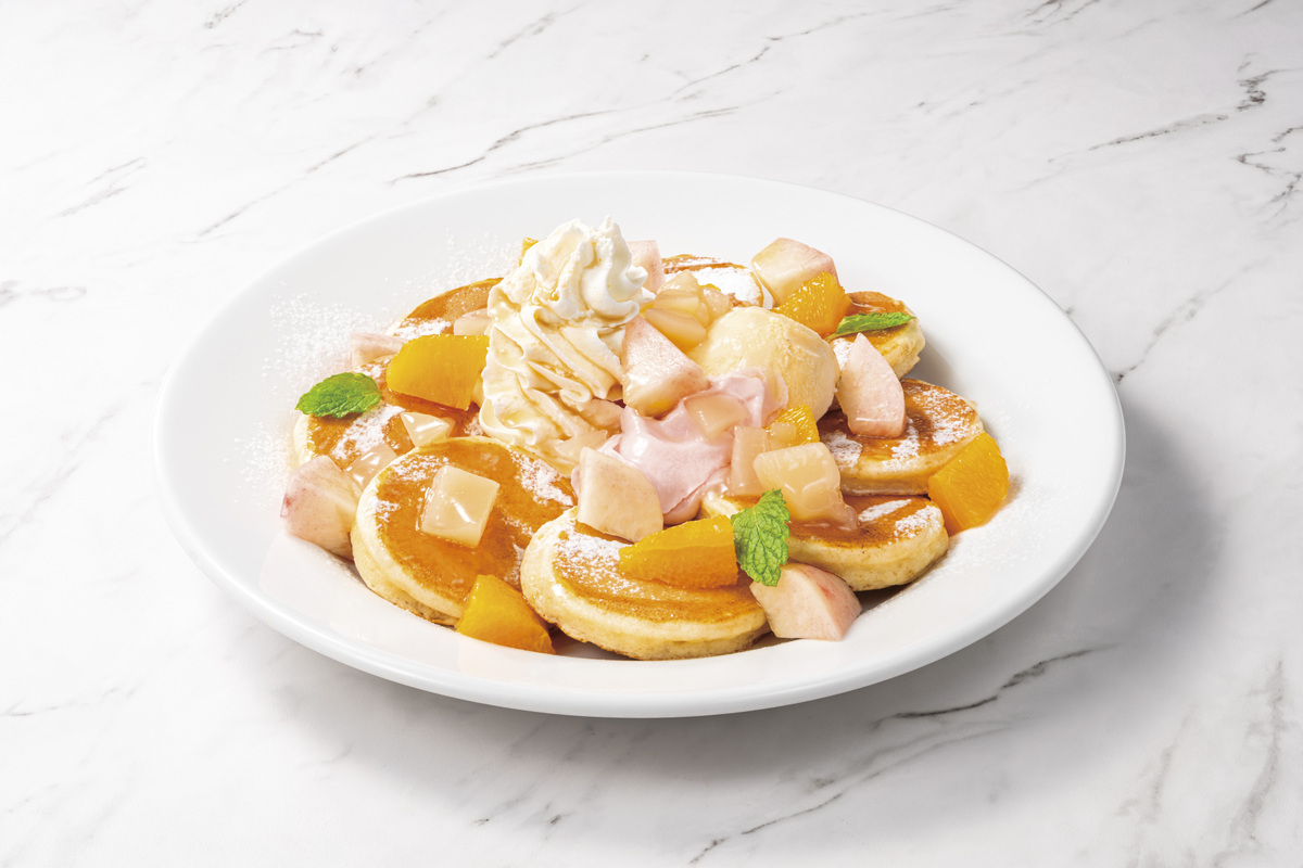 ふんわり、もっちりとしたパンケーキに、季節の桃をトッピング。なめらかな桃クリームやフルーティーなピーチソースをプラスして、風味満点に仕立てている。
