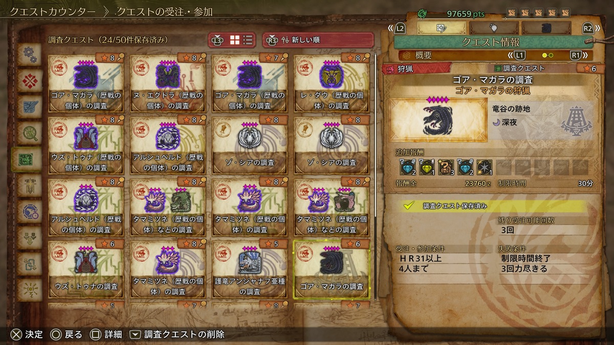 これは、6月30日のアップデート前に保存していた調査クエストの「モンスターサイズ」が変動してしまう不具合のことで、「最大金冠」サイズで保存したクエストのモンスターが小さくなったりしているものと思われる。なお、6月30日以降に保存した調査クエストについては、問題ないとのこと。