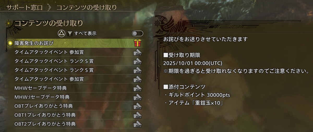復旧は8月初旬を見込んでおり、早期解決が困難であることから、全プレイヤーにお詫びとして「ギルドポイント3万」と「重鎧玉10個」を配布している。ゲーム内のサポート窓口「コンテンツの受け取り」より10月1日まで受け取り可能。