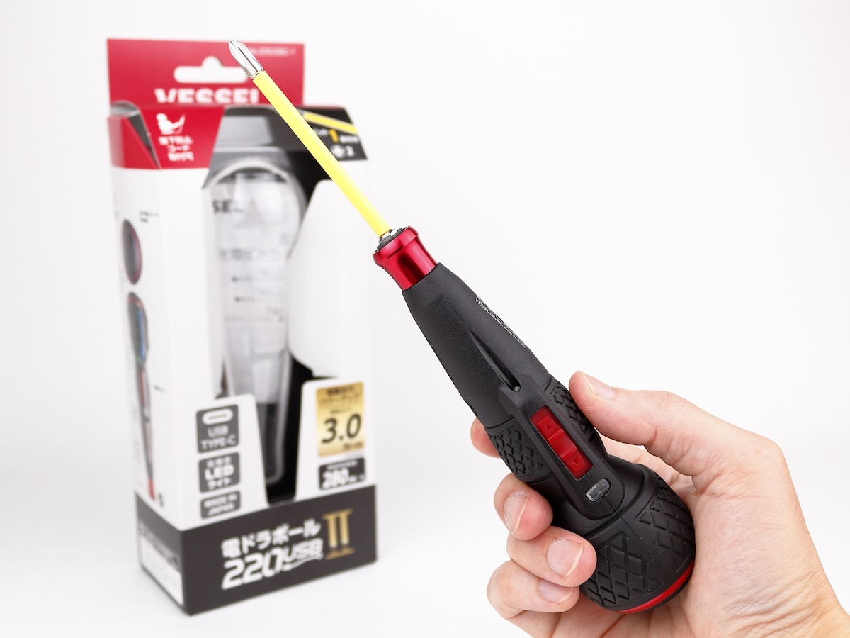 今回紹介するのは、この電ドラボールのシリーズに新しく加わった、ベッセルの「電ドラボールⅡ」(実売4900円前後〜)です。最大の特徴は、トルクが2.0N・mから3.0N・mへと強化されたこと。これにより、小型のネジなら手回しなしで締め付けることも可能となりました。
