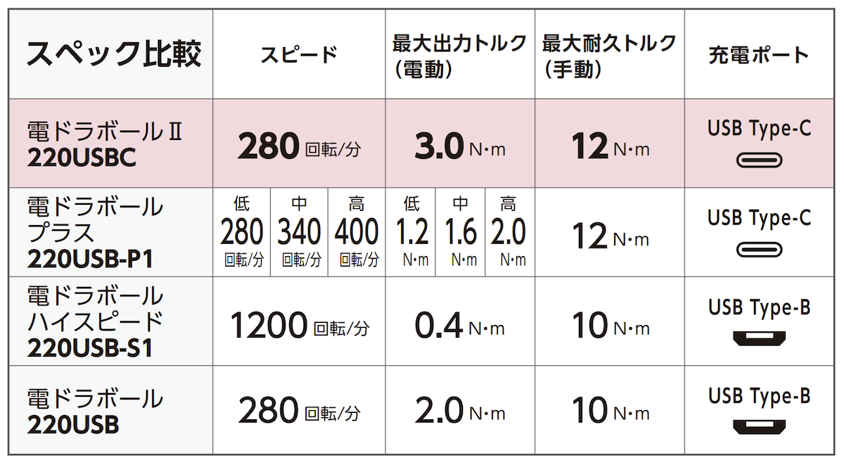 電ドラボールにはいくつか種類があり、毎分280回転でUSB Micro-B充電の「電ドラボール」(以下、初代)、回転数を毎分1200回転まで高める代わりにトルクが0.4N・mになった「電ドラボールハイスピード」(以下、電ドラハイスピード)、3段階の回転数切り替えとUSB Type-C充電に対応した「電ドラボールプラス」(以下、電ドラプラス)などがあります。