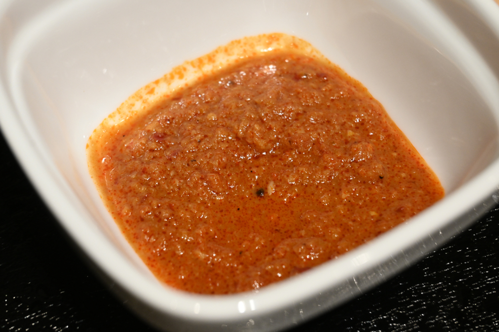 そして最大の特徴は、別添の「にんにくマシマシだれ」。おろしと刻みの2種類のにんにくを使用しており、パンチのある香りが食欲を刺激します。ソースは赤みが強くてとんでもない辛さのようにも見えますが、実際には激辛ではなく、旨みのあるほどよい辛さ。辛さよりも“にんにくのパンチ”を引き立てることを意識して開発されたそうです。