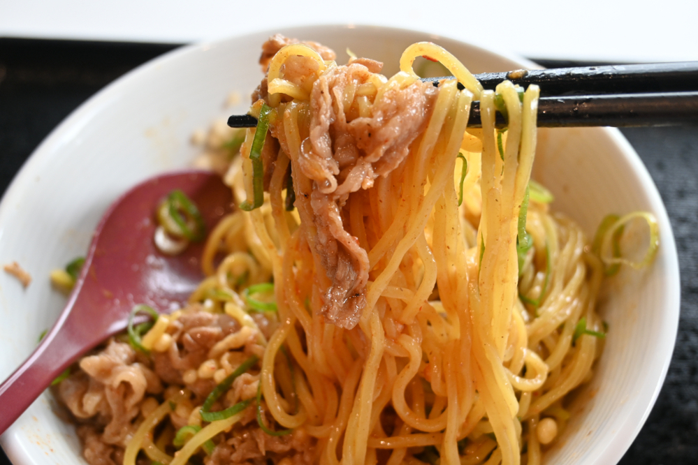 麺はストレートの中太麺です。そもそも、吉野家の店舗には麺を茹でるための設備がありません。担当者に話を聞いたところ、「今ある設備の中でできることをやろう」という方針のもと、冷凍麺を使うことで商品化を実現したとのことです。