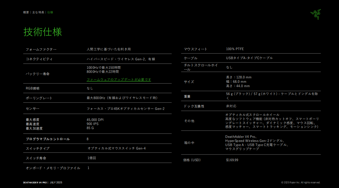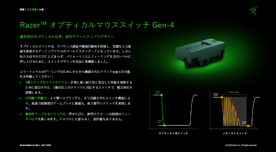 Razerは7月11日、同社の代表的なゲーミングマウスシリーズ「DeathAdder」の最新モデル「DeathAdder V4 Pro」を発表した。7月25日より販売開始、価格は2万8980円。