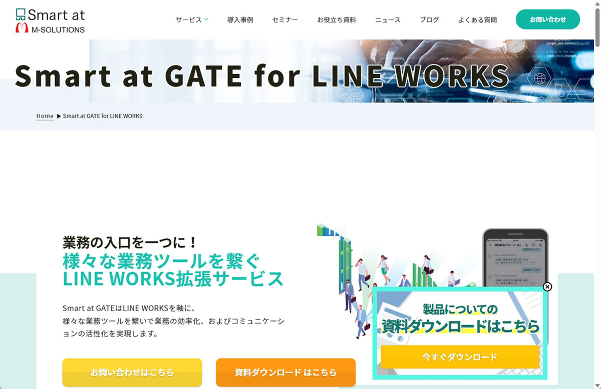 M-SOLUTIONS株式会社の「Smart at Gate for LINE WORKS」は、LINE WORKSを中心に、さまざまな業務ツールを連携・集約できる拡張サービスだ。LINE WORKSのトーク画面下部にオリジナルのリッチメニューを設置し、ワンタップで各種業務ツールやアプリケーション、URLへのアクセス、定型文の送信などを簡単に実現できるランチャーのような機能を提供する。