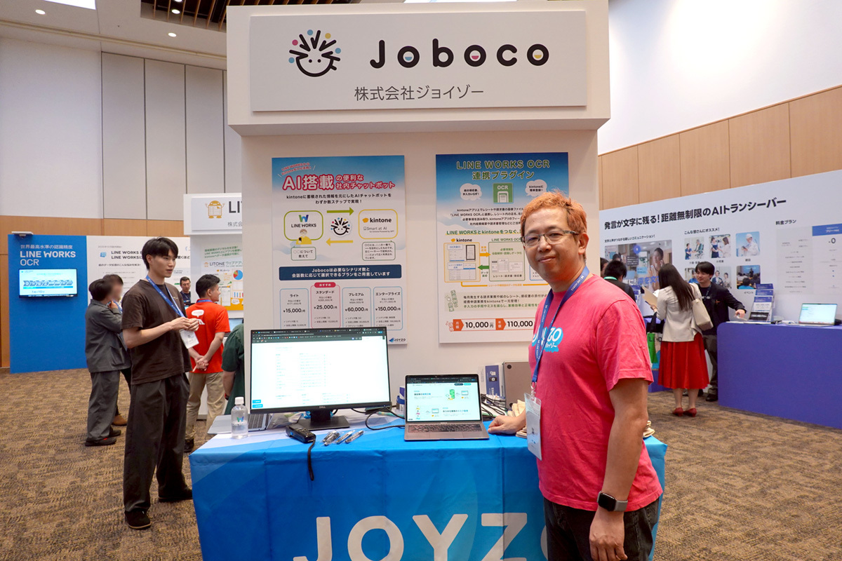 株式会社ジョイゾーのブースでは2つのプロダクトを紹介していた。まずは、LINE WORKSとkintoneを連携させるチャットボット作成サービス「Joboco(ジョボコ)」。kintoneで生成AIを利用できる「Smart at AI」(M-SOLUTIONS)と連携させ、kintoneに蓄積された情報を元に回答してくれるチャットボットを手軽に構築できるサービスだ。