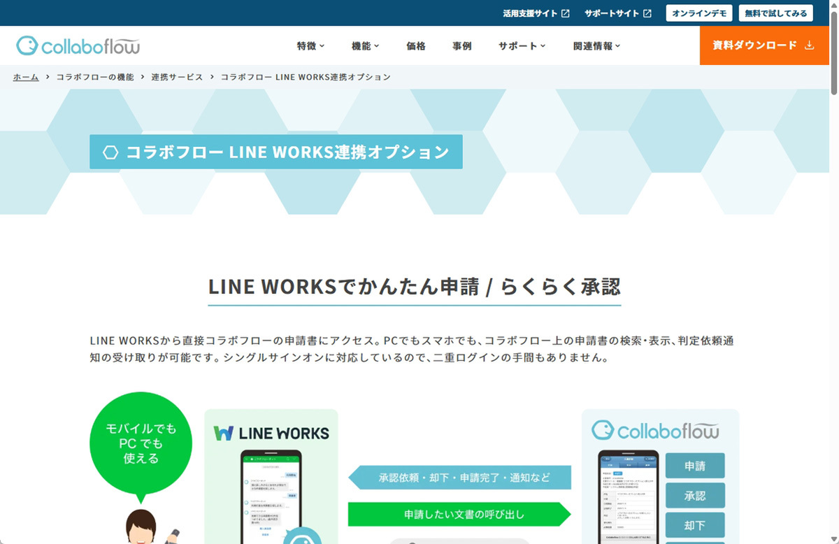 コラボフローは、申請・承認業務のデジタル化と効率化を実現するワークフローシステム。LINE WORKS連携オプションでは、PCやスマートフォンからLINE WORKSのトーク画面やホーム画面を通じて、コラボフロー上の申請書を直接検索・表示できるようになる。シングルサインオンにも対応しており、二重ログインの手間が不要で、ユーザー体験も向上する。