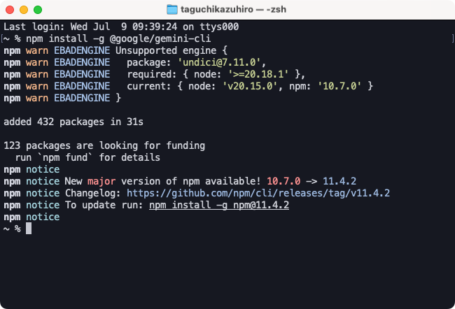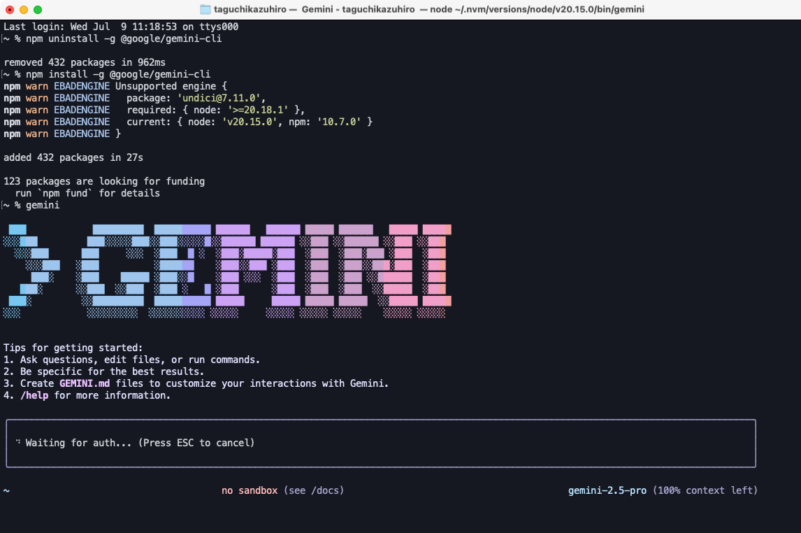 コマンド:npm install -g @google/gemini-cli
