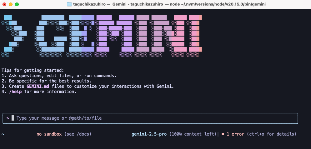個人のGoogleアカウントでログインすれば、無料で毎分60回、1日1000回まで利用できる。認証が完了すると、ターミナルにGemini CLIの画面が表示される。